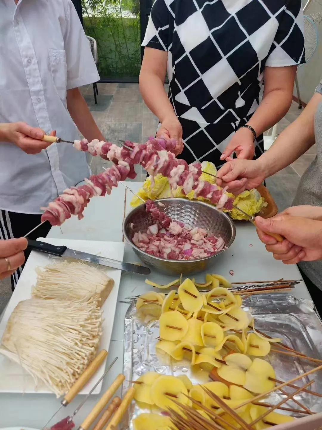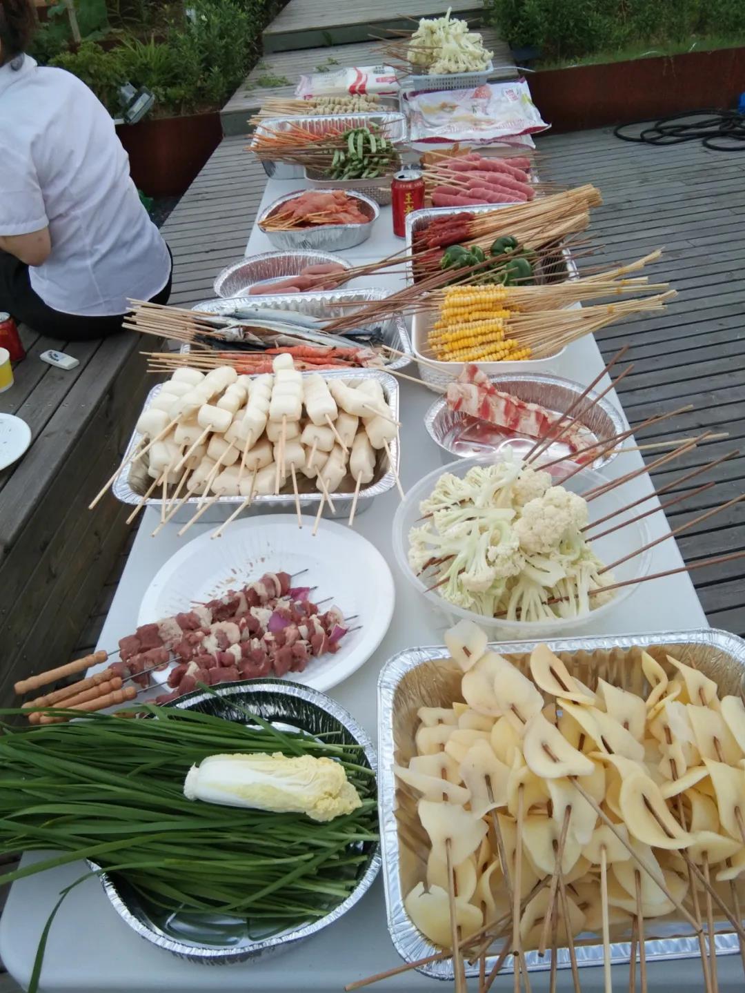 大家在積極忙碌著(zhù),擺盤(pán)、摘菜、串串,準備了整整兩大桌菜。